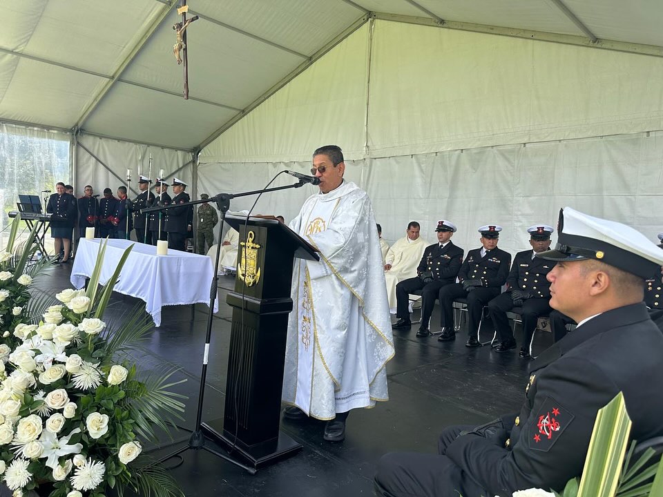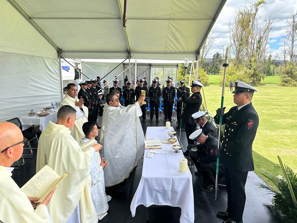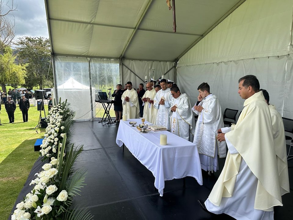 La Santa Eucaristía fue presidida por Monseñor Jorge Cuasialpud, Vicario General del Obispado Castrense, y contó con la presencia del señor Ministro de Defensa, Dr. Pedro Sánchez, los altos mandos de las Fuerzas Militares y de la Policía Nacional, así como los Capellanes Generales que acompañan espiritualmente a nuestros héroes y a sus familias.