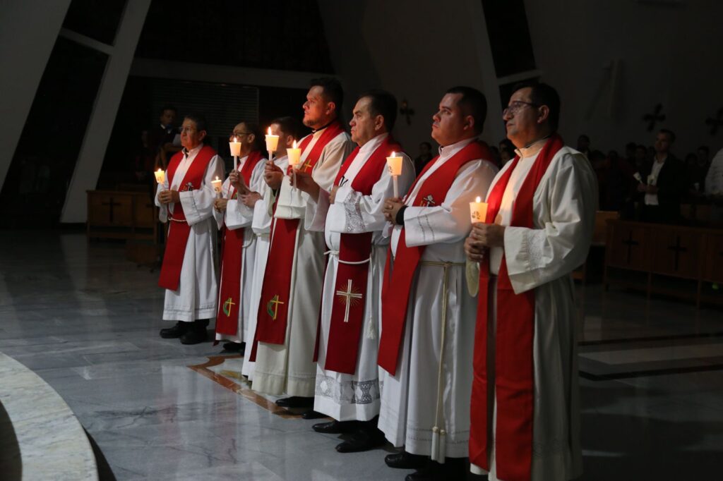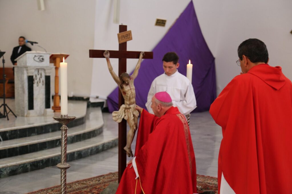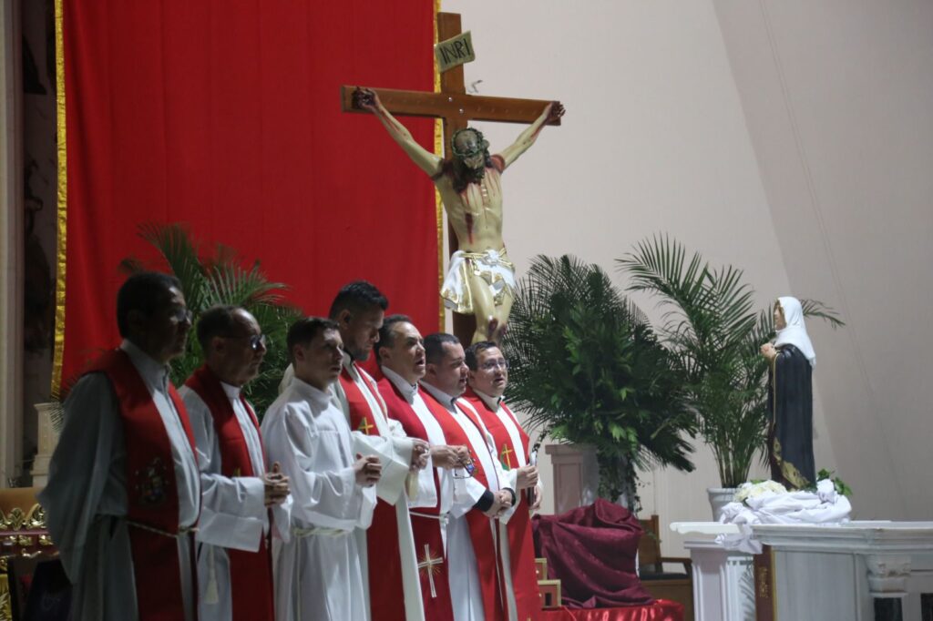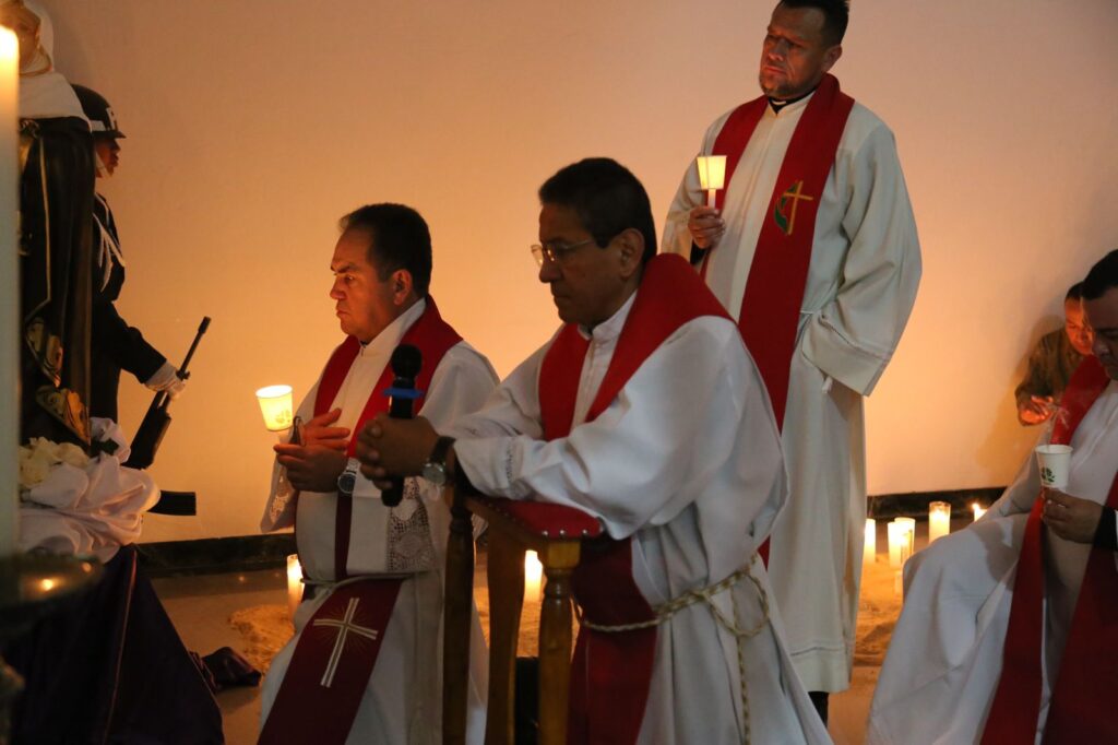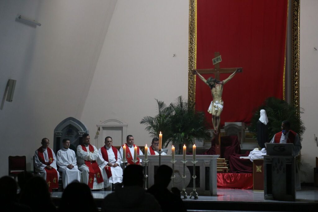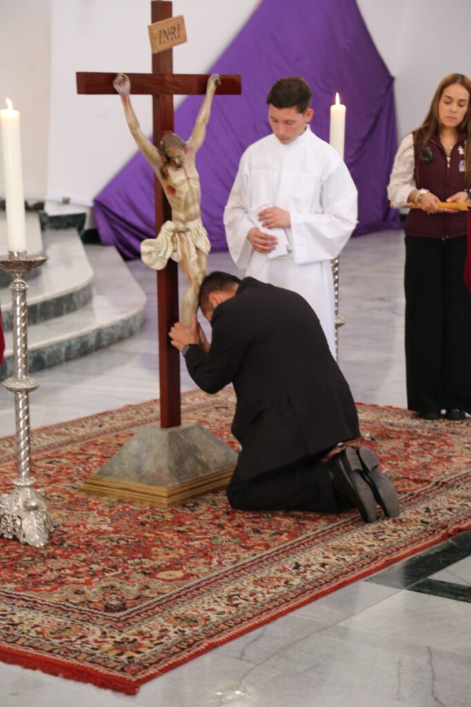 Posteriormente, a las 3:00 de la tarde, hora en que la Iglesia conmemora la muerte del Señor, se celebró la Liturgia de la Pasión del Señor, seguida de la adoración de la Santa Cruz, un momento de veneración y silencio que invitó a los fieles a contemplar el misterio del amor redentor de Cristo.